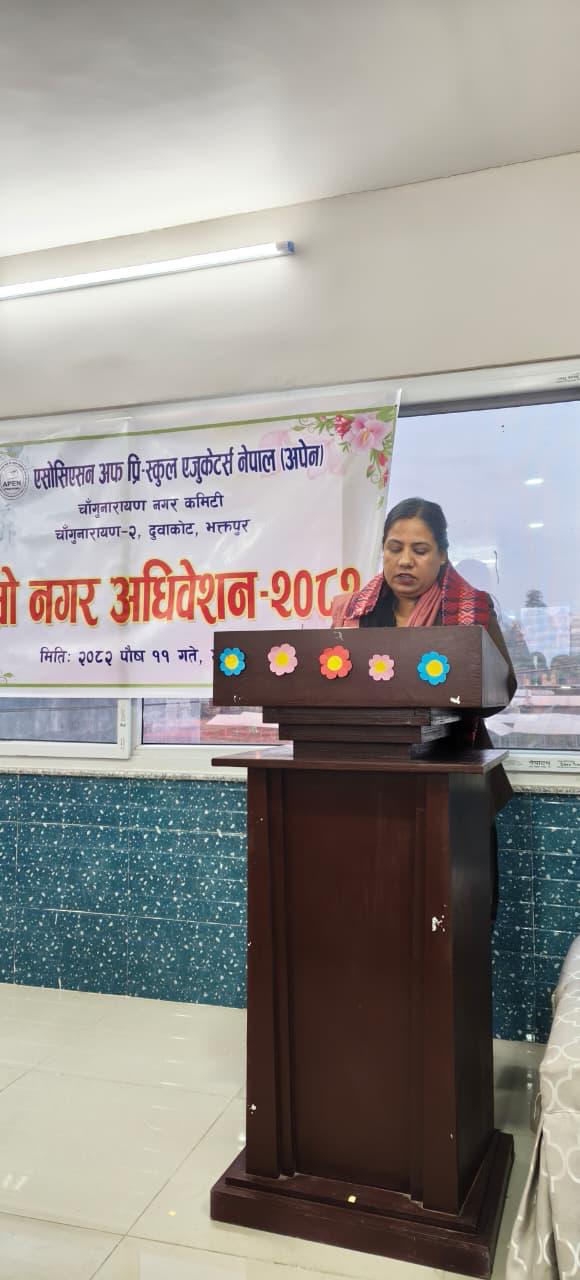 अपेनका केन्द्रीय महासचिव कृष्ण कुमार बोहराको प्रमुख आतिथ्यतामा सम्पन्न उक्त कार्यक्रमलाई सम्बोधन गर्दै प्रमुख अतिथि बोहराले प्री(स्कुल शिक्षा बालबालिकाको सिकाइको मुख्य जग भएको र यसलाई गुणस्तरीय बनाउन अपेनले खेल्दै आएको भूमिकाको प्रशंसा गर्नुभयो। उहाँले निजी क्षेत्रबाट सञ्चालित विद्यालयहरूका समस्या समाधानका लागि नीतिगत तहमा पहल गर्नुपर्नेमा जोड दिनुभयो। कार्यक्रममा विशेष अतिथिका रूपमा बोल्दै अपेन केन्द्रीय सदस्य तथा अधिवक्ता अनिल आचार्य र भक्तपुर जिल्ला अध्यक्ष योगेश खड्काले संस्थागत एकता र शिक्षकहरूको क्षमता अभिवृद्धिमा नगर कमिटीले देखाएको सक्रियता अनुकरणीय रहेको बताउनुभयो।
